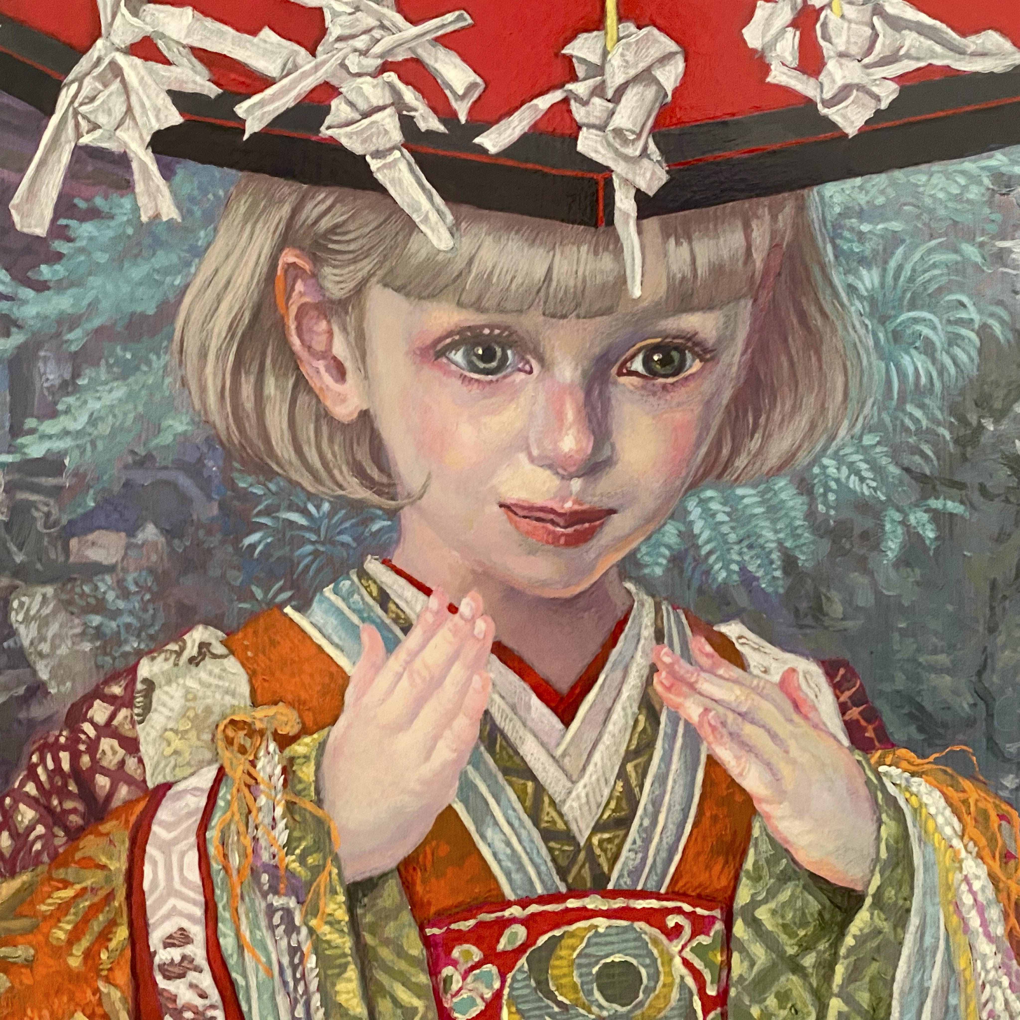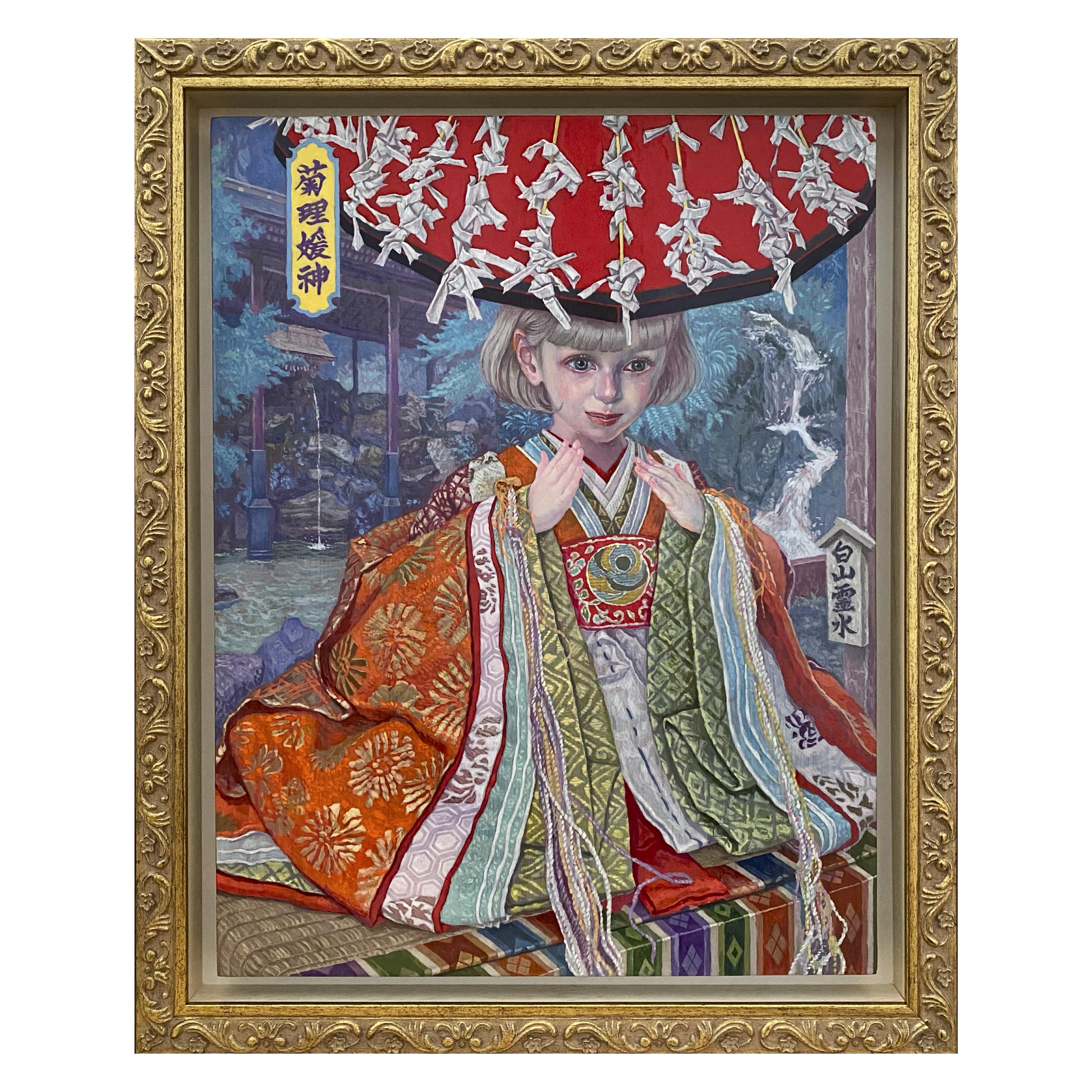 石川県の白山比咩神社の主祭神である菊理媛神(ククリヒメノカミ)をモチーフに 描いた。 菊理媛神は『日本書紀』に登場する女神で、イザナギに禊を勧めた神として、生ま れ清める浄化や再生を司る。また、黄泉の国の境でイザナギとイザナミを仲裁した 神として、結びや和合の神ともされる。 私が白山比咩神社を訪れた時、境内はちょうど七五三の家族連れで賑わっていた。 再生や結び、和合を司る神の姿を、祭事で着飾った子供の姿と重ね合わせて描いた。